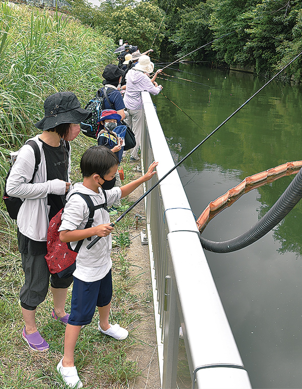 子どもたちが川に親しむ自然体験の場を提供する「かわさき水辺の楽校」が8月7日、恒例の魚釣りイベントを二ヶ領用水の宿河原取水口近くで開催した。親子ら40人が釣りと、網を使った川底の生き物観察「ガサガサ」を楽しんだ。