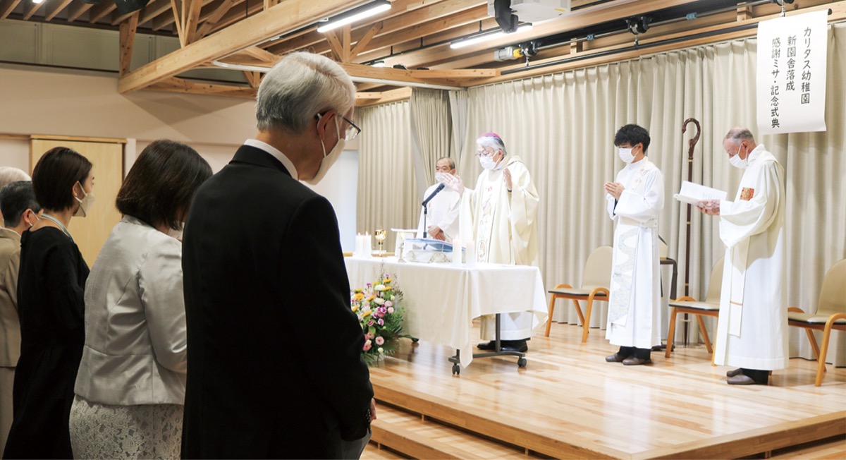 感謝ミサでは、カトリック横浜教区長の梅村昌弘司教が式を進行。新園舎完成に感謝し、祈りを捧げ、聖歌に思いをのせた。記念式典には多摩区の藤井智弘区長や市幼稚園協会の鈴木伸司会長も参列し、年長児の歌や合奏が花を添えた。