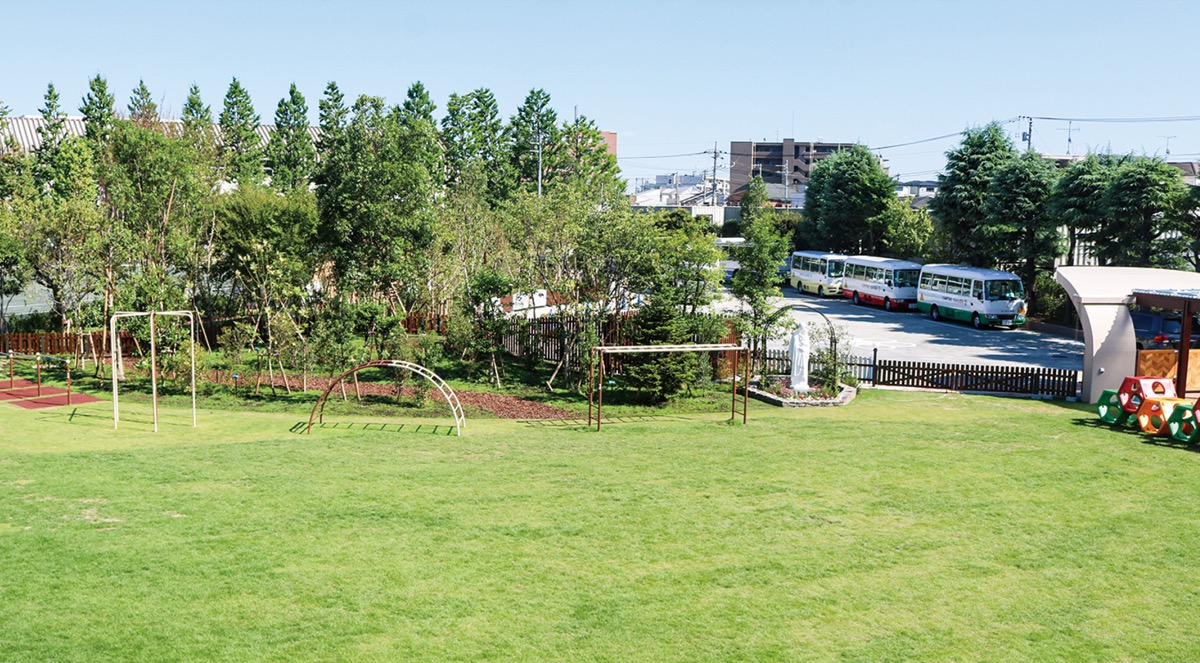 中野島のカリタス幼稚園(木田まゆみ園長)が9月10日、新園舎の落成式を開催した。カリタス学園関係者や設計・施工会社、近隣の幼稚園、町会などから、感謝ミサと記念式典に各80人ほどが参加。先月に工事が完了したばかりの園庭と「カリタスの森」、バスロータリーもお披露目された。