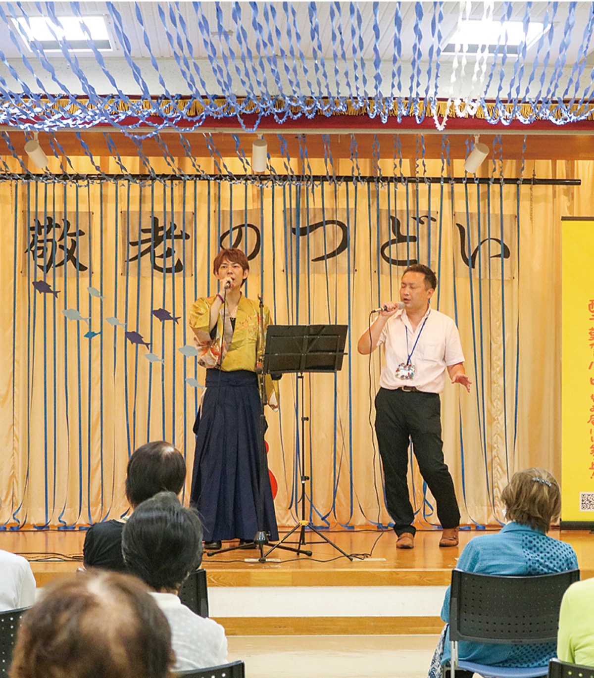 合唱曲『翼をください』では、マスク姿のまま小さな声で歌を口ずさむ来場者も。敬老のつどいを企画した同センター職員の伊東知之さん=人物風土記で紹介=もサプライズで登壇。松尾さんと『夏の終りのハーモニー』をデュエットし、会場を沸かせた。