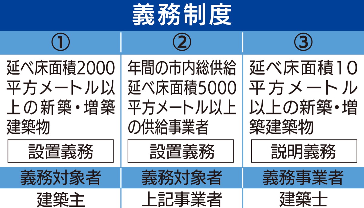 2050年までの二酸化炭素排出実質ゼロを目標に掲げ、市が20年に策定した脱炭素戦略「かわさきカーボンゼロチャレンジ2050」を受けた動き。市は7月の環境審議会脱炭素化部会で、制度の素案「再エネ義務・支援等総合促進事業(仮称)」を公表。【1】延べ床面積2000平方メートル以上の新築・増築建築物(設置義務)【2】年間の市内総供給延べ床面積5000平方メートル以上の供給事業者(同)【3】延べ床面積10平方メートル以上の新築・増築建築物(説明義務)--の、3種類の義務制度を検討している。