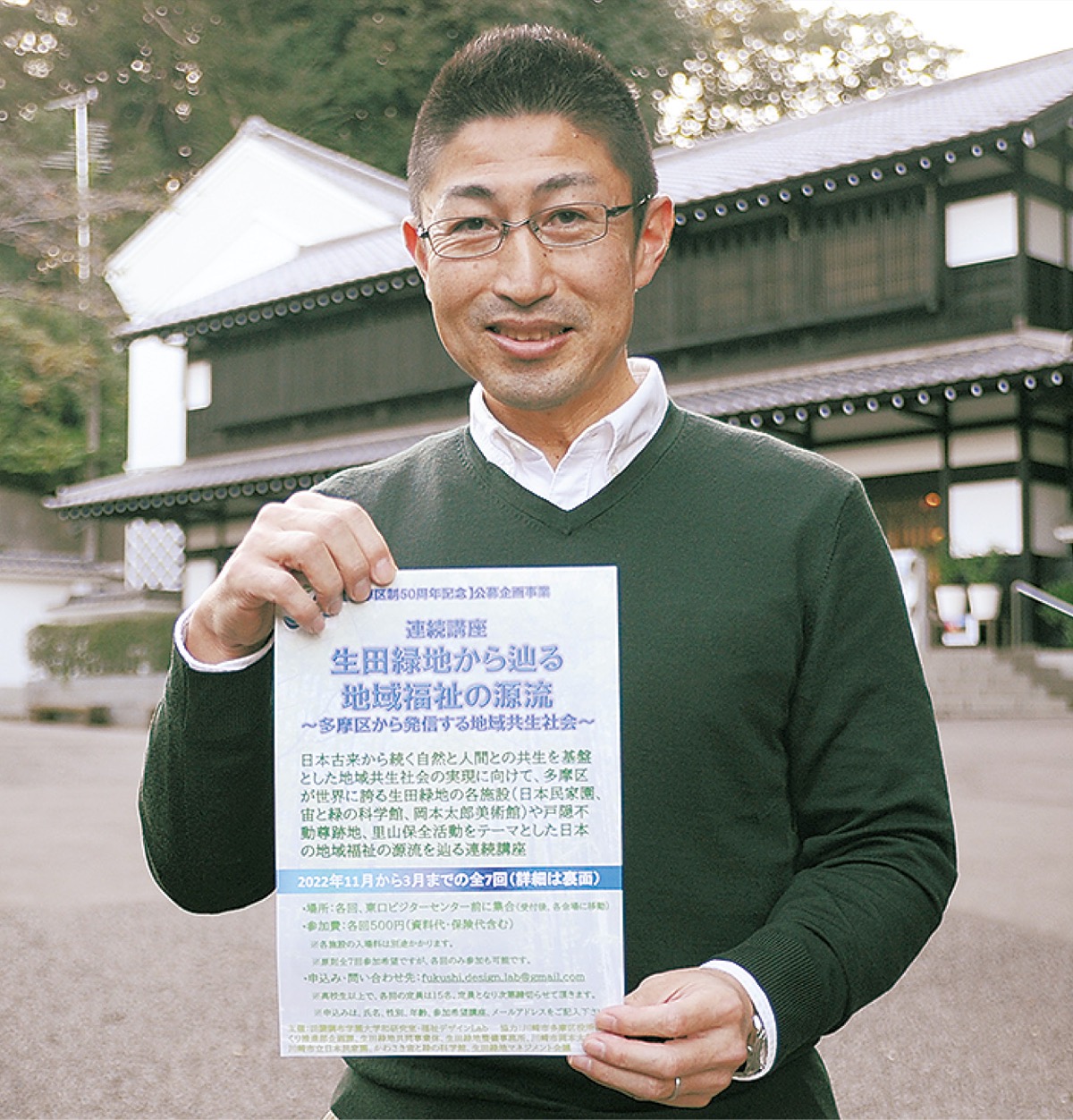 多摩区制50周年を記念した公募事業企画として、生田緑地や共生社会をテーマにした連続講座が11月12日から始まる。進行役は東生田在住で田園調布学園大学准教授の和(かのう)秀俊さん(49)。日本民家園や岡本太郎美術館、戸隠不動尊跡地など緑地内の各資源を通じて、地域福祉の源流に全7回の講座で迫る。