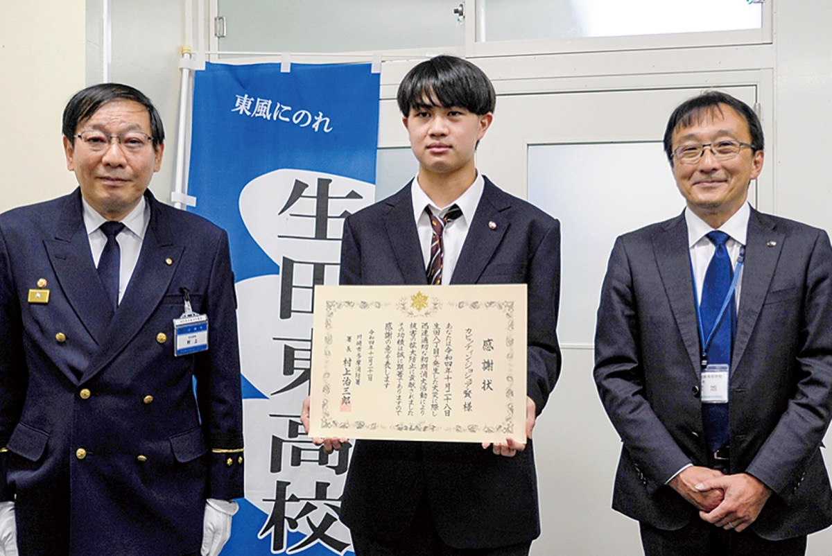 県立生田東高校(宮地淳校長)1年のカビッティン・ジョシュア・賢さんが火災の初期消火に貢献したとして、多摩消防署(村上治三郎署長)が11月21日、同校で感謝状を贈呈した。