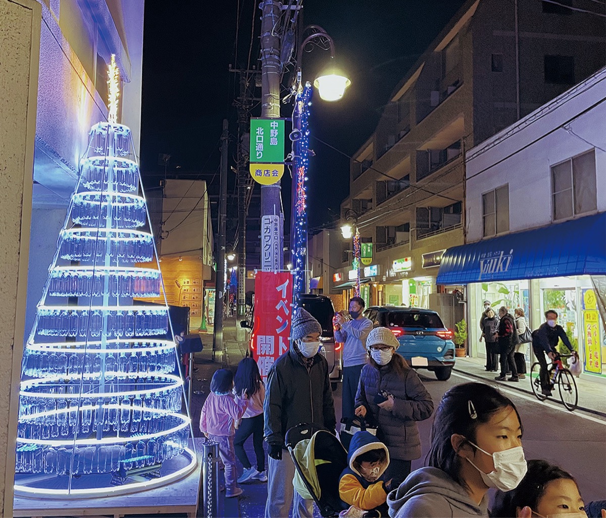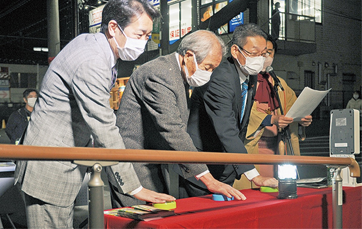 国の「がんばろう!商店街事業」(旧GoTo商店街事業)の再開に伴い、2年越しに実現。3日は午後5時半から、中野島小児科クリニック前で点灯式を開催した。島峯諭副会長は「イルミネーションで、安心安全な通りとしてご利用いただければ」と発信。田村会長は「商店会はお互いに助け合いながら頑張っている。これからも努力し、要望に応えていきたい」と語り、点灯ボタンを押すと会場は光と拍手に包まれた。