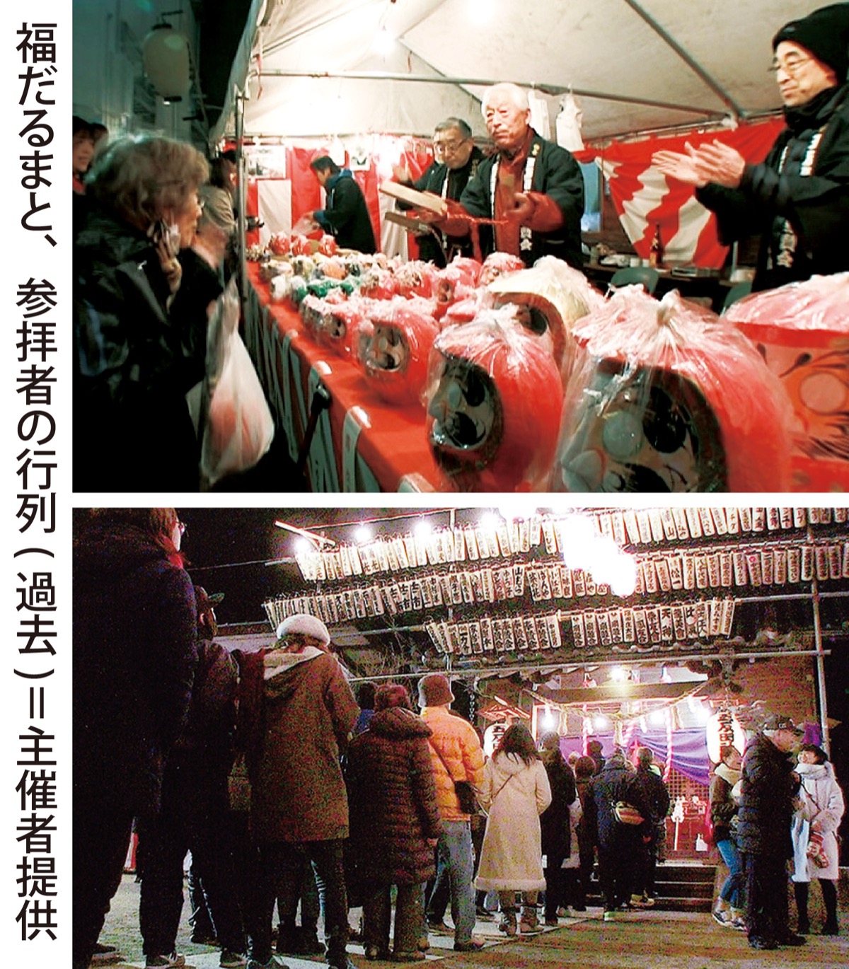 三が日は境内で、参拝者に甘酒が振る舞われる。今回も福銭は手渡しと盆置きともに取りやめ、拝殿の鈴と房は設置しない。福だるまをはじめ御札や破魔矢、おみくじ、お守りは感染対策を十分に講じ販売する。磯野会長は「コロナもだいぶ収まりつつある。参拝をお待ちしております」と地域に呼びかける。