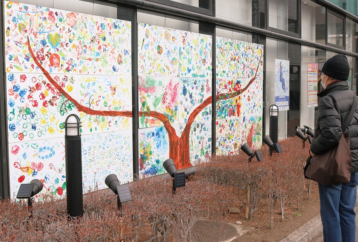 このアートが設置されたのは昨年11月、JAセレサ主催の農業まつりでのこと。菅支店の職員が話し合い、「地域のみんなでアートを作ろう」と企画した。同支店の組合員が中心となり、18枚のパネルに多摩川梨の木を描いた後、1枚ずつ各所へ配布。青壮年部や女性部の菅支部に加えて、保育所8園、幼稚園1園にも協力を呼びかけた。