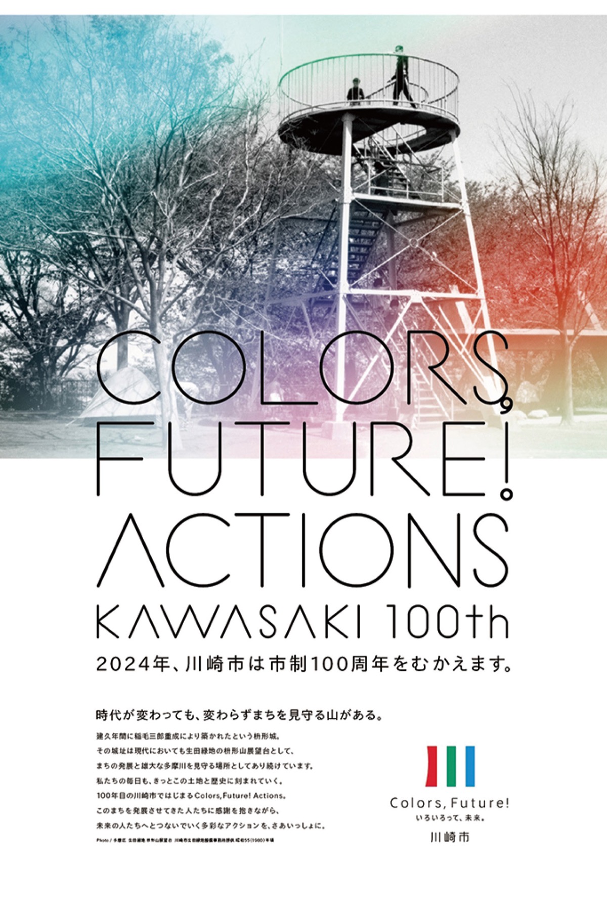ポスター中央にあしらわれている「Colors,Future! Actions」は、市民、企業、団体等のオール川崎市の皆が主役となり、協働・共創しながら、多様で多彩なアクションを展開。次の100年に向けて「あたらしい川崎」を生み出していく取り組みにつなげていこうとの願いが込められている。
