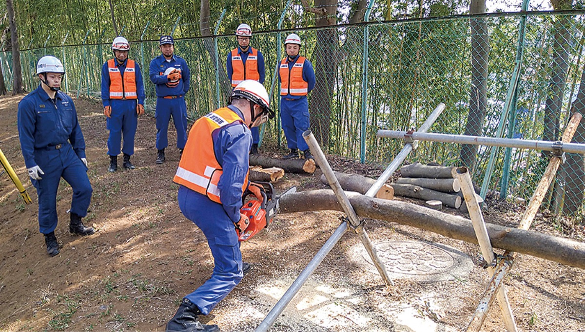 今回は消防署員の指導のもと、エンジンカッターとチェーンソーの点検や取り扱い、切断を実践。機動部隊統括隊長の井口保副団長は「今後起こりえる大地震や土砂災害発生時に、消防署と消防団が連携して地域を守るため今後も訓練を行っていく」と気持ちを新たにした。