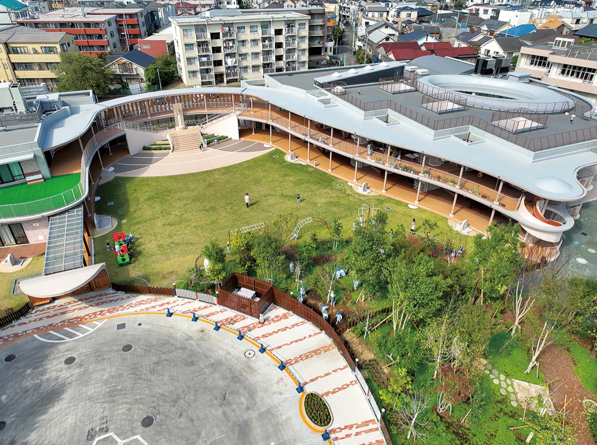 新園舎は2022年春に完成し、旧園舎の跡地に園庭と「カリタスの森」を整備。建物の高さを抑え、壁面は低彩度の暖色系とし、周辺の住宅地との調和を意識している。既存樹木の保全や木のフェンスなど、緑の景観も高い評価を受けた。