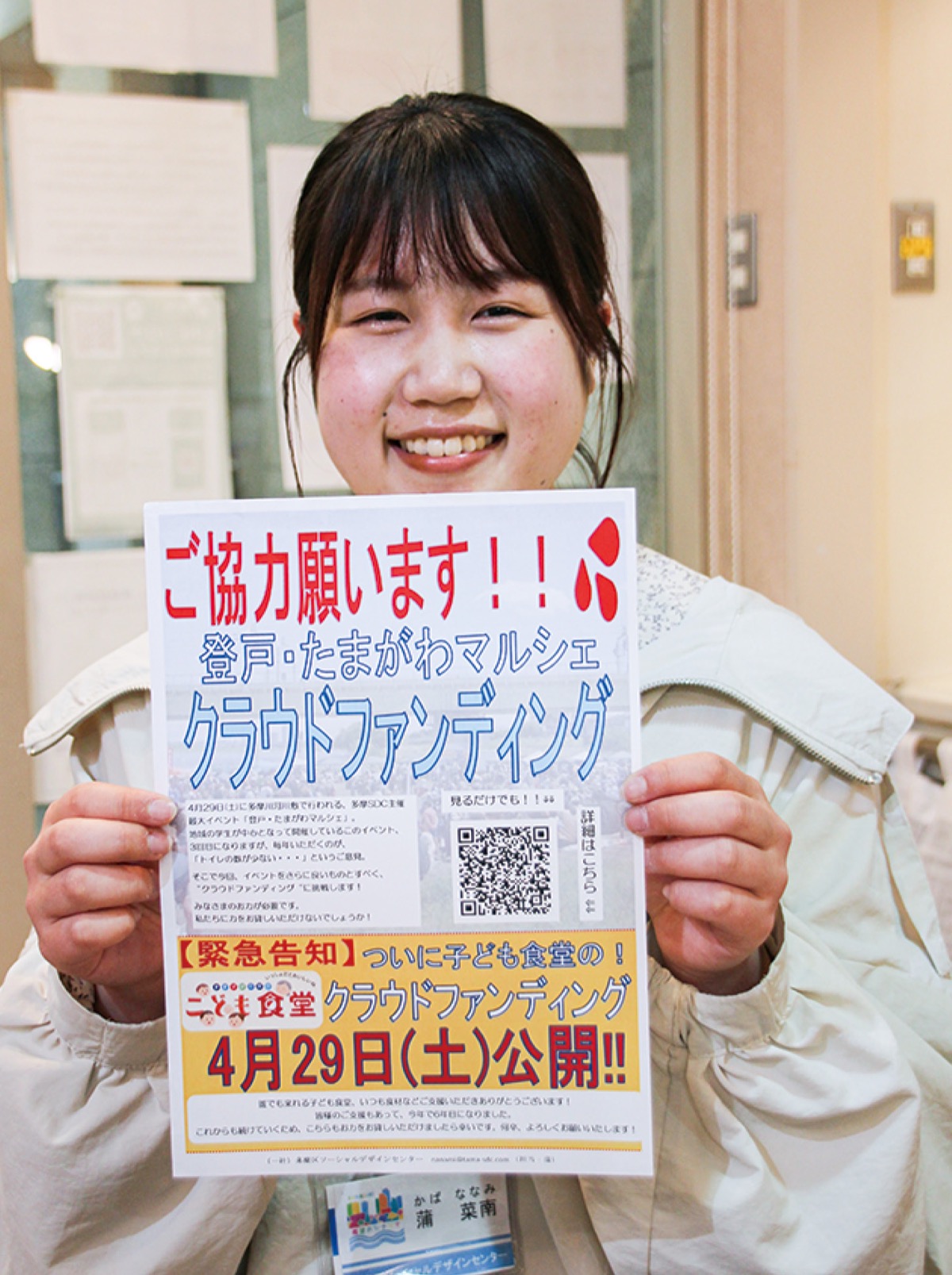 会場周辺にトイレが少ないことが課題となっており、今回トイレを設置するにあたり地域に支援を呼びかけようと、広く寄付を募ることができるCFを行うことにした。目標金額は30万円。トイレ8基の設置費用や紙代などにあてる。返礼品としてパサージュ・たま(障害に関する理解と関心を深める事業)の商品券などが用意されている。マルシェの副責任者で、CFを担当する蒲菜南さん(大学3年)は「皆さんに安心してイベント楽しんでいただくため、ご協力をお願いします」と話す。