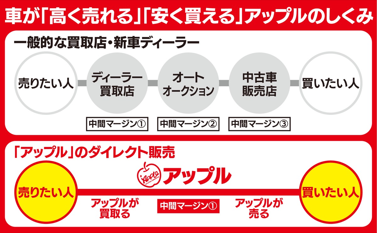 アップルは、中間業者のいない「ダイレクト販売」で余計な中間マージンが発生せず、安心価格での販売を実現する。「スタッフ厳選の車両を取り揃えております。お話を伺い、ご希望に合わせて提案させていただきます」と小幡さん。