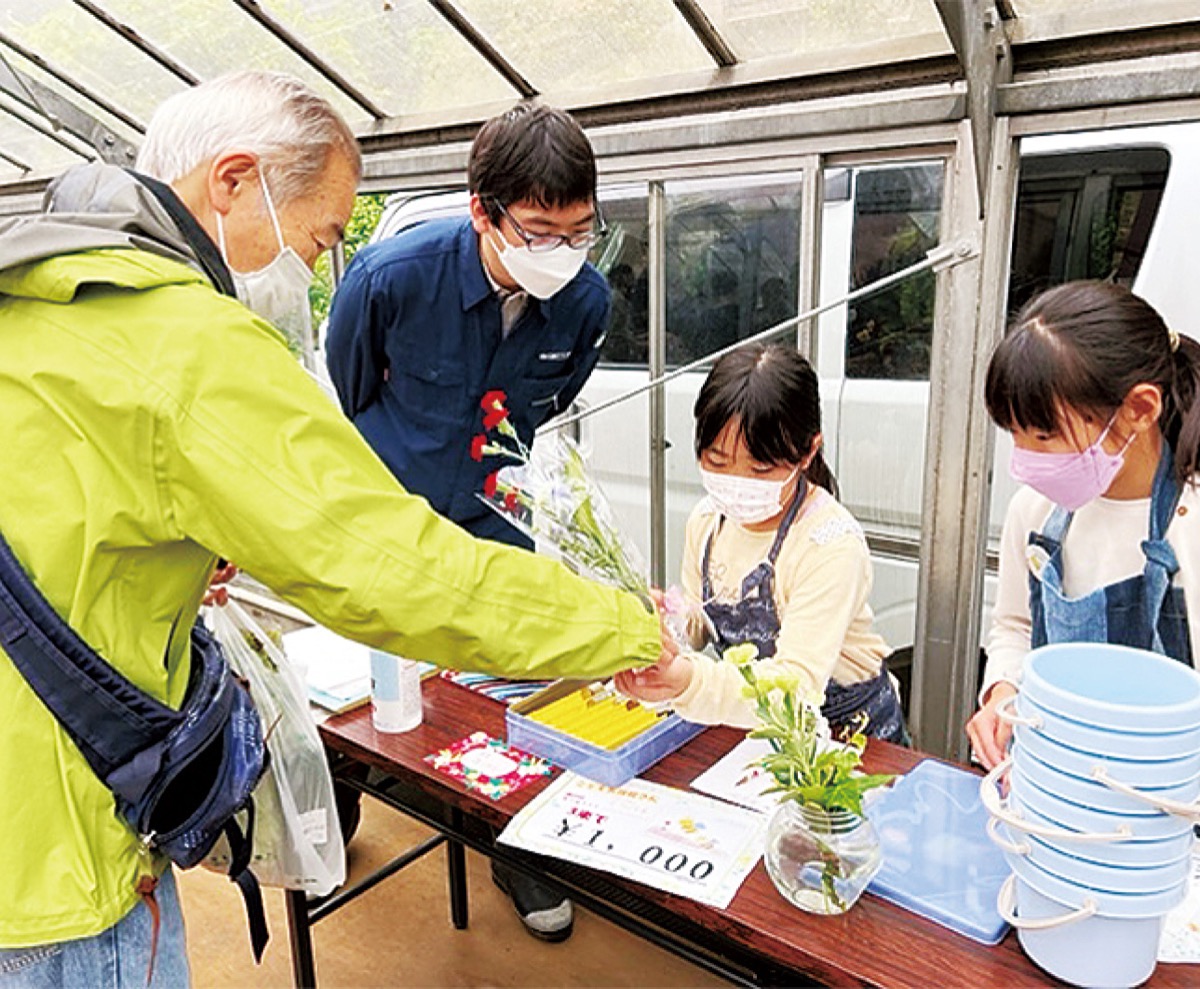 川崎市緑化センターで5月13日、子どもたちがカーネーションのプチブーケを作り販売するイベント「こどもお花屋さん」が行われた。