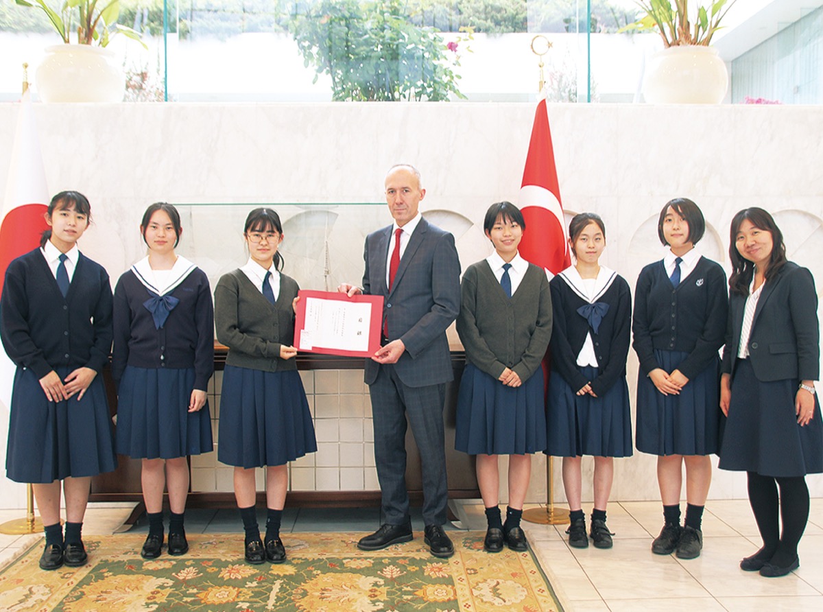 当日、6人は顧問の佐々木未欧教諭、保護者2人と共に同大使館を訪問。出迎えたジェミル・ウフック・トールル一等参事官、エスラ・オズベク一等書記官らと面会し、寄付の目録を手渡した。参事官は、「日本の学生がトルコに思いを馳せてくれて感銘を受けている」と謝辞を述べた。