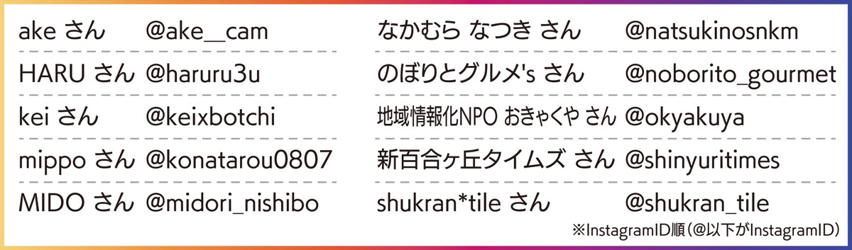自然や文化施設といった地域資源を活用して、インスタグラムで多摩区の魅力を内外に発信し、交流人口の増加などにつなげる取り組み。多摩区役所が5月に募集して20代から70代まで56人の応募があり、その中から10組が選ばれた(10組のIDを左下の表で紹介)。