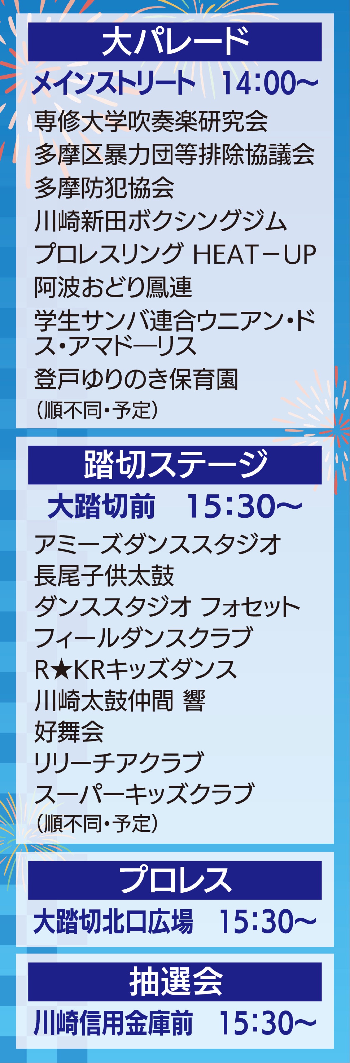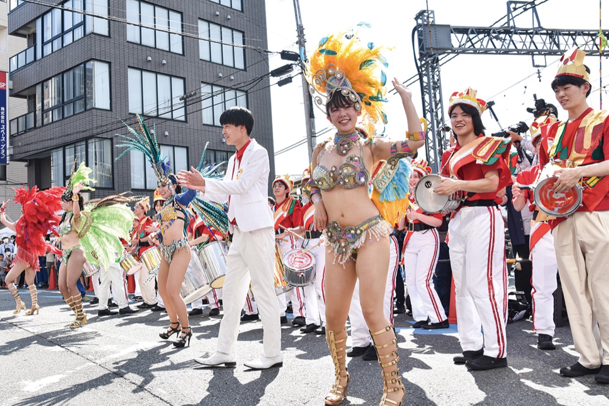 例年4万人以上(主催者発表)が訪れる風物詩。昨年コロナ禍の中止から3年ぶりに復活して盛況を博した。今年も午後2時から大パレードを開催。専修大学吹奏楽研究会、川崎新田ボクシングジムなど地元ゆかりの顔ぶれや学生サンバ連合、保育園児らが歩行者天国となるメインストリートを練り歩く。