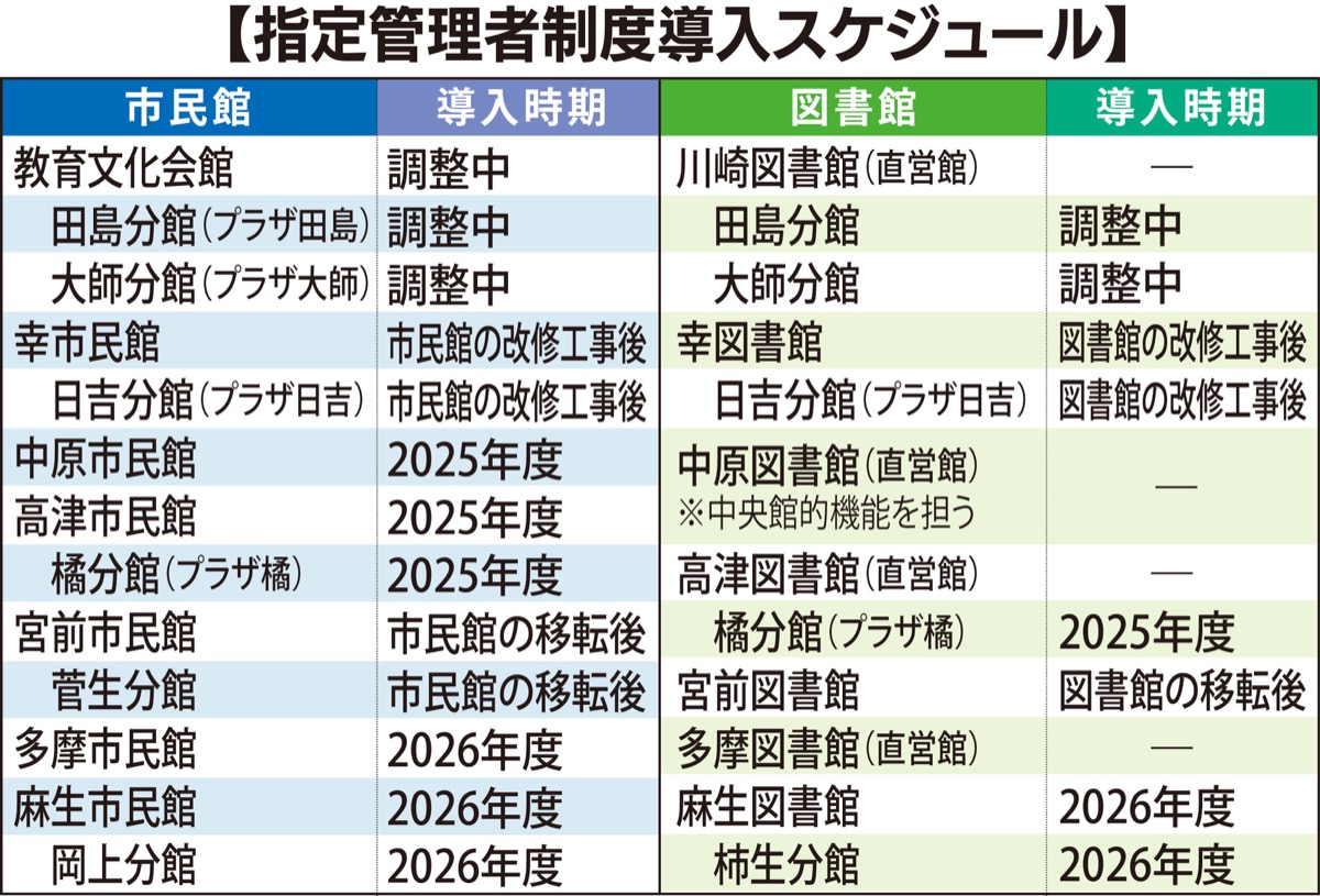 市は2024年度以降に全市民館と幸、宮前、麻生の図書館で指定管理者制度を導入するため、条例改正案を9月の市議会に提出する見通し。老朽化する施設の移転・改修を進めるとともに民間のノウハウを活用し、市民のニーズに沿った生涯学習拠点を目指す。
