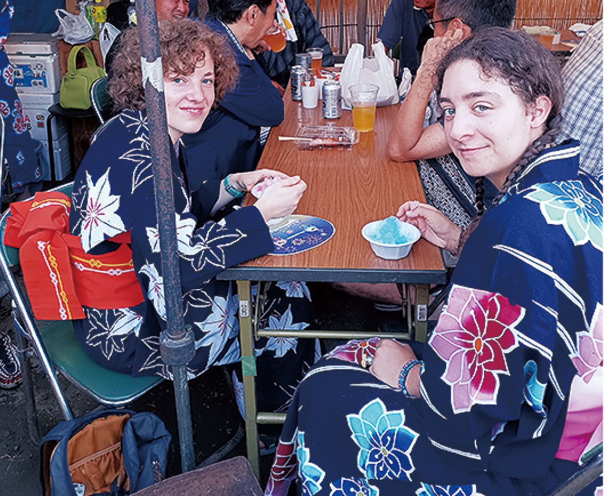 5日に来日した2人は翌6日、原島さんに着付けを学ぶと、人生で初めての浴衣を着て、八雲神社で4年ぶりに開催された城下親和会の納涼盆踊り大会に参加。かき氷や焼き鳥を食べ、地元の人たちには盆踊りを教わった。所作を覚えると2人は境内に設けられたやぐらに上がり、音楽に合わせて踊りを楽しんだ。デュペロンさんは「浴衣は軽くて良い。でも帯が少しきつい」と苦笑い。シャネイさんは「『踊りが上手』と褒められた」とうれしそうに話した。