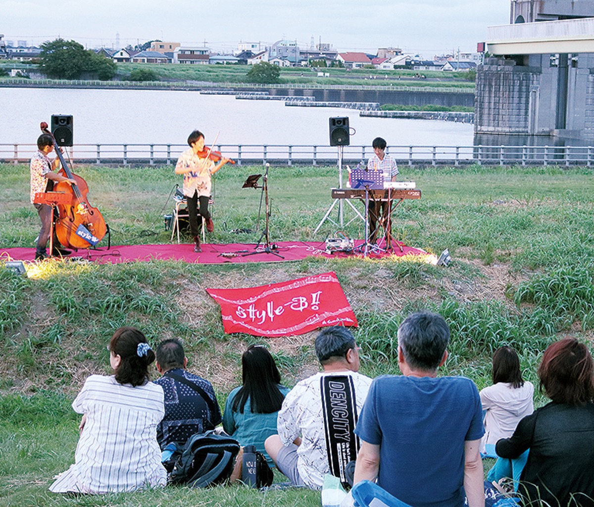 当日は、ポップインストユニット「style―3!」の高嶋英輔さん(バイオリン)、長澤伴彦さん(コントラバス)の2人に、サポートメンバーとしてピアニストの白井洋旭さんが加わり約15曲を演奏。会場は盛り上がりを見せた。都内から同僚と訪れたという岡田朋子さん(53)は「多摩川のほとりできれいな夕焼けを見ながら素敵な音楽を聴け、夏の終わりの良い思い出になった」と笑顔を見せた。