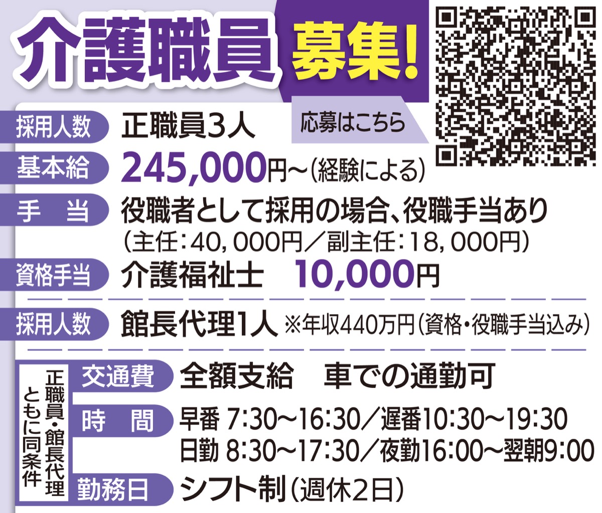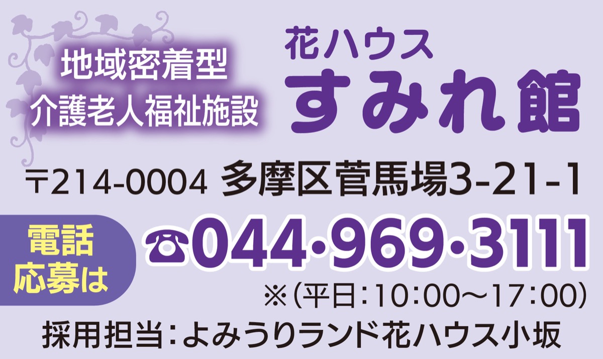 読売新聞社を母体とする社会福祉法人が運営する小規模な特別養護老人ホーム「花ハウス すみれ館」(多摩区菅馬場)では、現在、介護の正職員と館長代理を募集している。館長代理は、入所者のケアとともに管理業務も担当する。