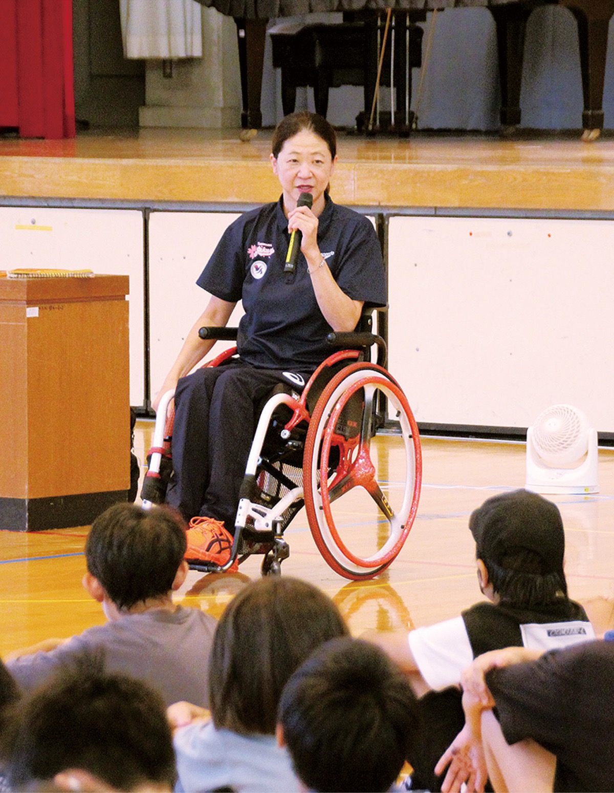 児童の前に車いすで登場した成田さんは、「見た目ではわからない病気や障害のある人がいることを忘れないで」「困っている人には『手伝いましょうか』と勇気を出して声をかけて。その人にとって何が必要かを確かめて」と呼びかけた。