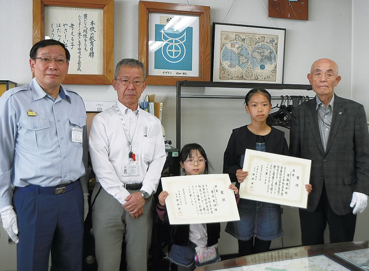 村上署長と岸井会長が同校を10月26日に訪れ、倉島さんと銀賞を受賞した青木美怜さん(3年)に表彰状を手渡した。
