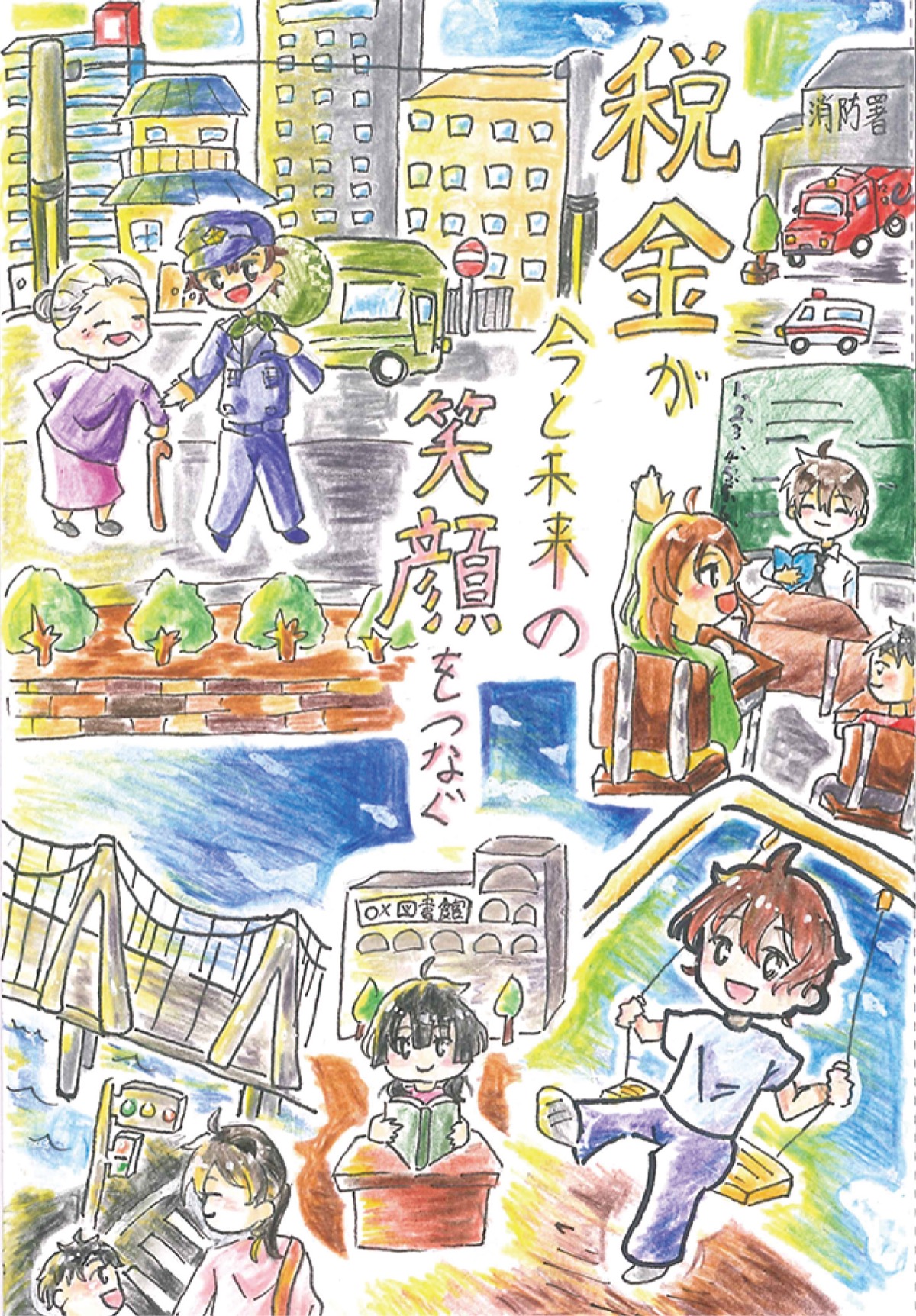 金賞を受賞した星野さんは「趣味でいろいろ絵を描いているけど、賞をもらったことがなかった。自分が選ばれると思っていなかったのでうれしい」と受賞を喜び、「少子高齢化で1人の高齢者に払う税金が少なくなっていると聞いた。しっかり税金を払って社会を支える大人になりたい」と感想を話した。