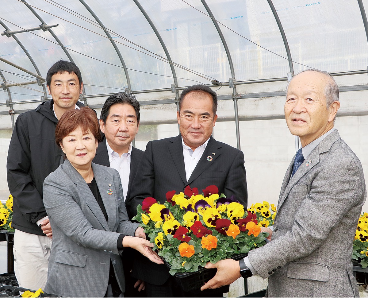 当日は、地元生産者の花で地域を彩るという趣旨のもと、菅仙谷にある原嶋花園から譲り受けた橙、赤、黄色など色とりどりのパンジーの苗が、越水支店長とJAセレサ川崎の上原新三理事、関谷京子理事から、菅町会会長でもある濃沼実行委員長に手渡された。
