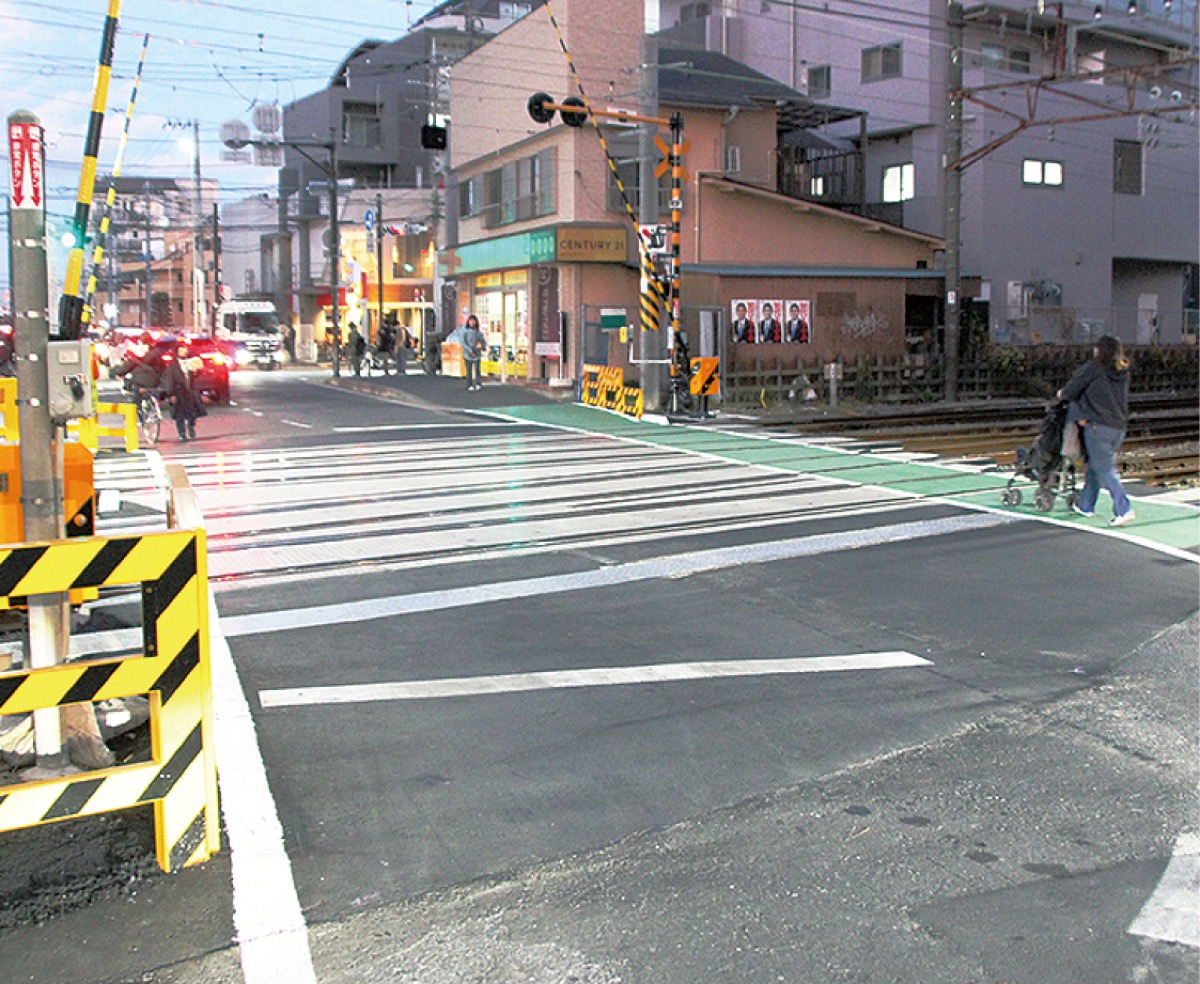 市はJR東日本と連携し、線路の分岐器に支障のない範囲で、幅員を8mに拡幅する工事を2022年度から開始。このほど、約2mの歩行者空間を確保し、道路の形状も改善。南側に車両用の防護柵も設置した。