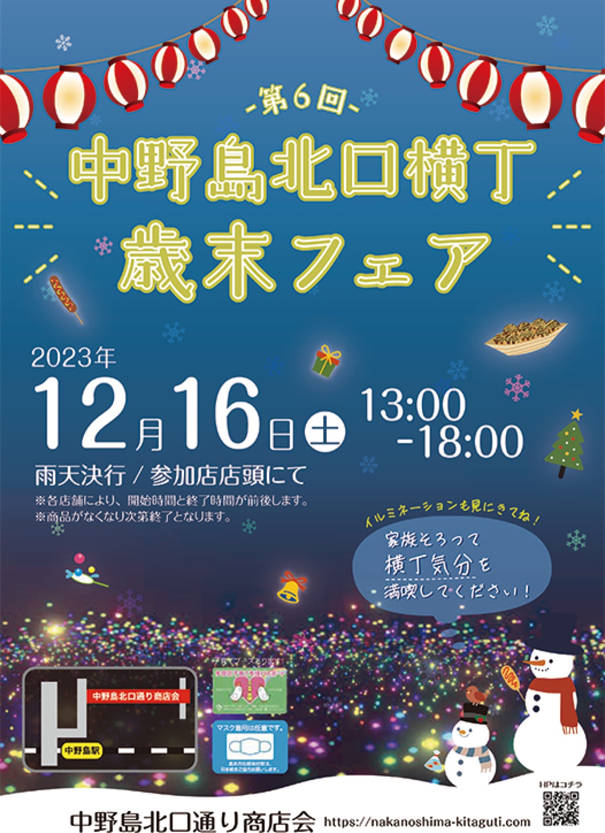 中野島北口通り商店会(田村弘志会長)は12月16日(土)、利用客への感謝を込めたイベント「横丁歳末フェア」を開催する。午後1時から6時(店舗により開始、終了時間に差異あり)。雨天決行。