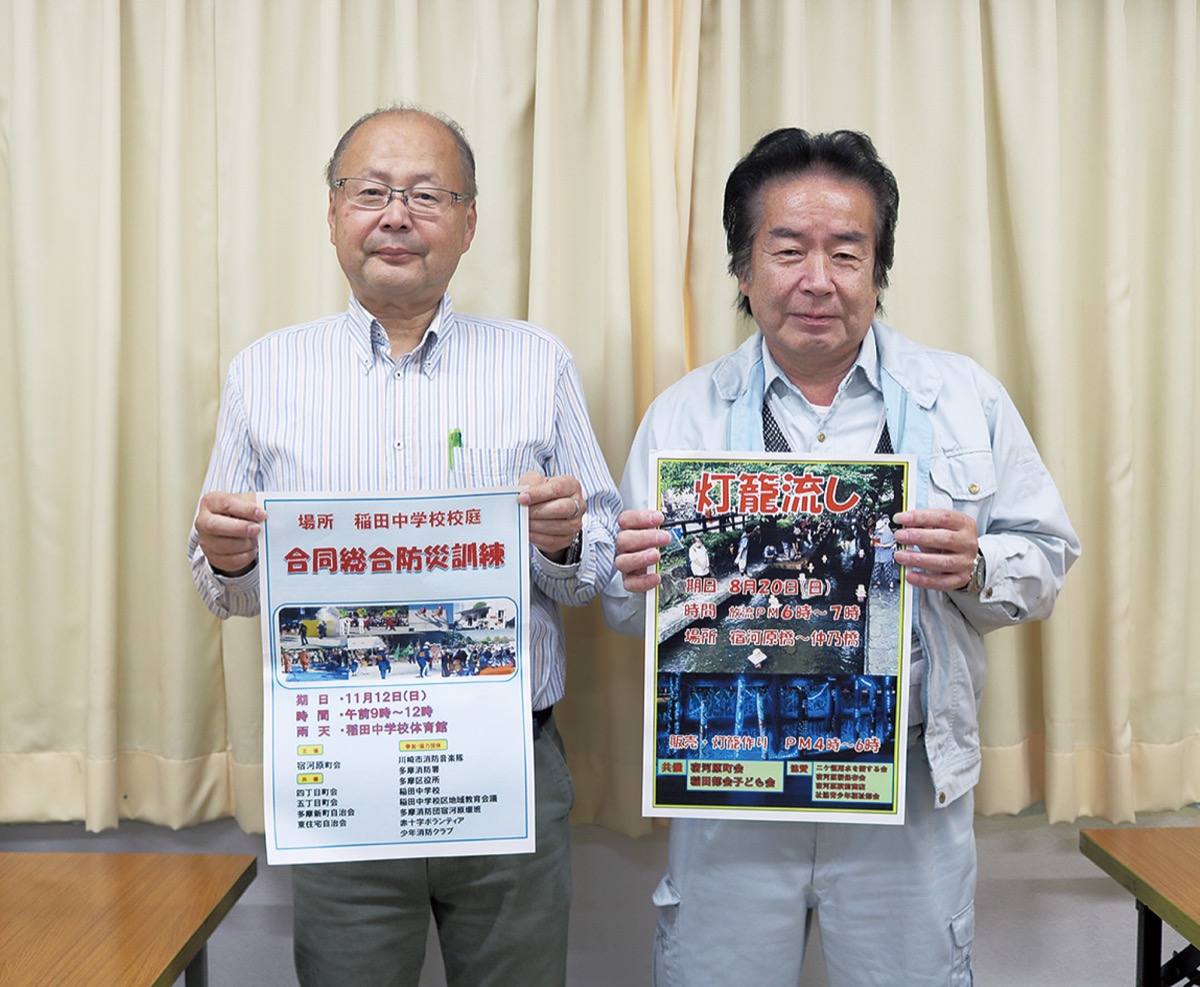 11月には、4年ぶりに「宿河原地区防災訓練」が開催され、参加者数は500人を超えた。半年前から準備を進め、特に子どもに楽しんでもらえるよう工夫を凝らしたという。消防服の子ども用サイズを用意して、消防車の前で写真が撮れるコーナーや放水体験、地震体験車など、多くの企画を行った。井田光一副会長は「マンネリ化を防ぎ、楽しみながら防災意識向上につながれば」と思いを述べた。大津会長は「長く行事を続けるには、負担の集中を避けることが大切。『楽しむ』気持ちを共有して、さまざまな人たちと協力することが鍵」と語る。