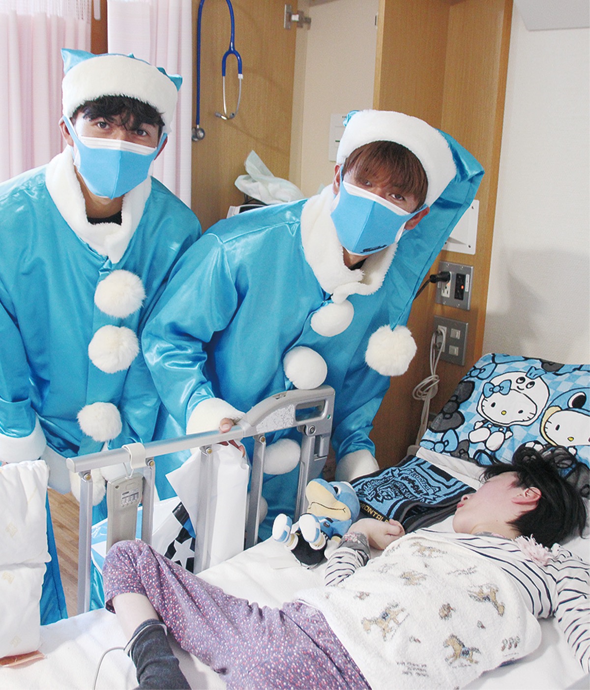 川崎フロンターレのMF大関友翔選手(18)と名願斗哉選手(19)が12月22日、水色のサンタクロースに変身し、川崎市立多摩病院(宿河原)を慰問した。