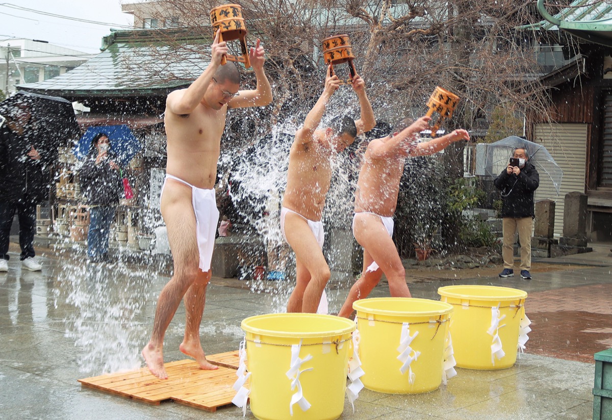 水行をきっかけに寺に多くの人が足を運んでもらいたいとの思いから2022年1月に始めた。今年で3回目。水をかぶった内海恵祐副住職は「力がみなぎった。地域の人にお寺を知ってもらう機会になれば」と話した。水行を見た人は「迫力があり、刺激になった。ご利益があると思う」と笑顔を見せた。