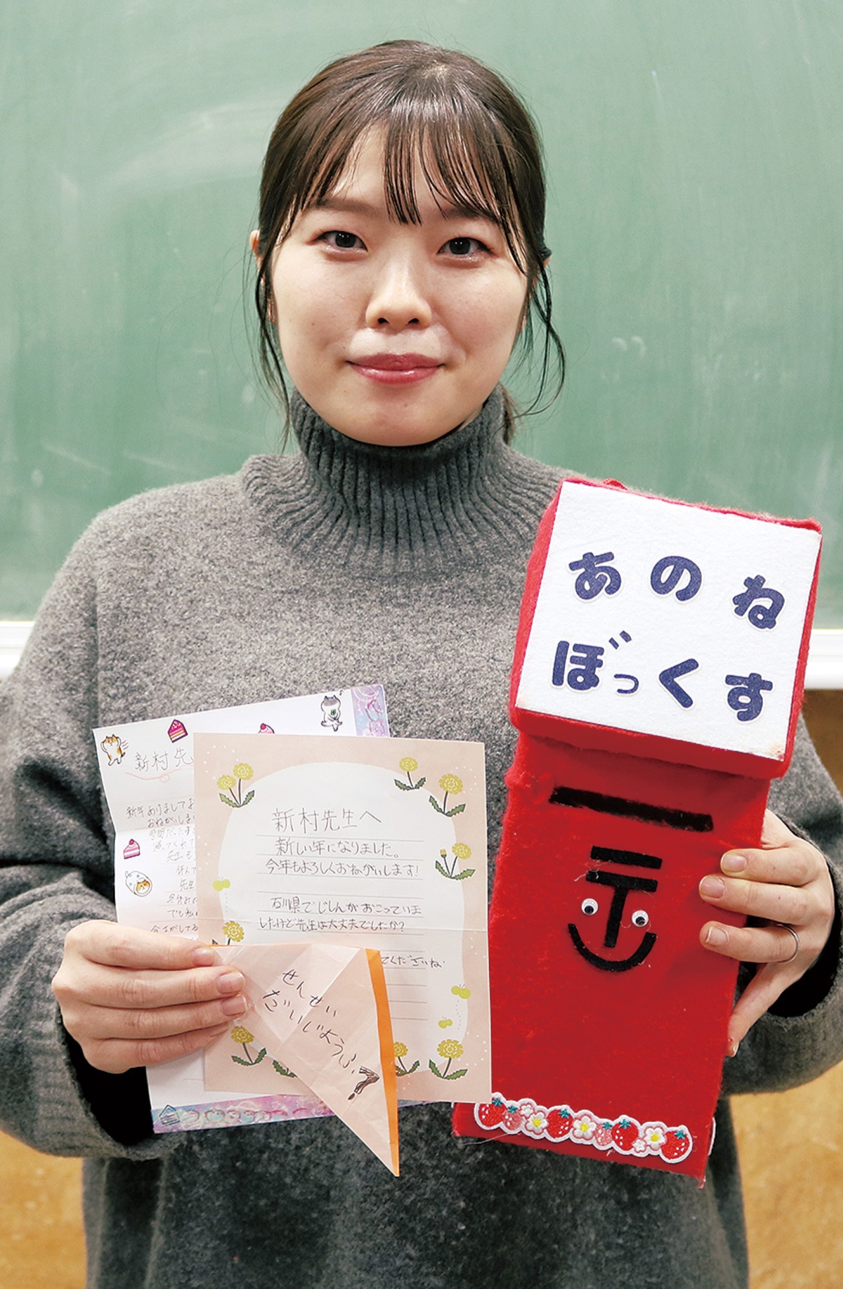 「悩みなど、先生に伝えたいことがあれば、何でも書いて入れてね」。そう児童に伝え、昨年5月に設置した「あのねぼっくす」。牛乳パックなどで手作りした。そこには、新村さんを心配するメッセージが書かれた折り紙が入っていた。また、手紙も手渡された。
