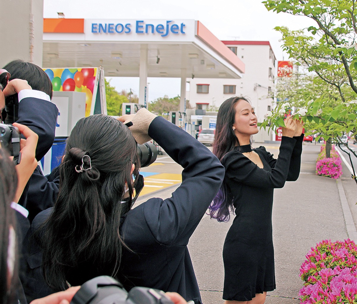同商店会では毎年、通り沿いのハナミズキとツツジが咲く季節にコンテストを実施している。撮影会は2021年に始めて3回目。生徒は談笑を楽しみながらも、被写体の表情を逃すまいと手にした一眼レフやスマートフォンを構えた。同部部長を務める永嶋夏帆さん(2年)は「気軽に話しかけてくれて楽しくなり良い写真が撮れた。自分だけの一枚を撮るため髪を直す仕草や一瞬の笑顔を見逃さないよう気をつけた」、副部長の小泉康一郎さん(同)は「こちらのリクエストでモデルが表情を変えてくれてアイデアや発想力が鍛えられた」と振り返った。Harunaさんは「皆さん熱意があった。和やかな雰囲気で撮れてよかった」と笑顔を見せた。