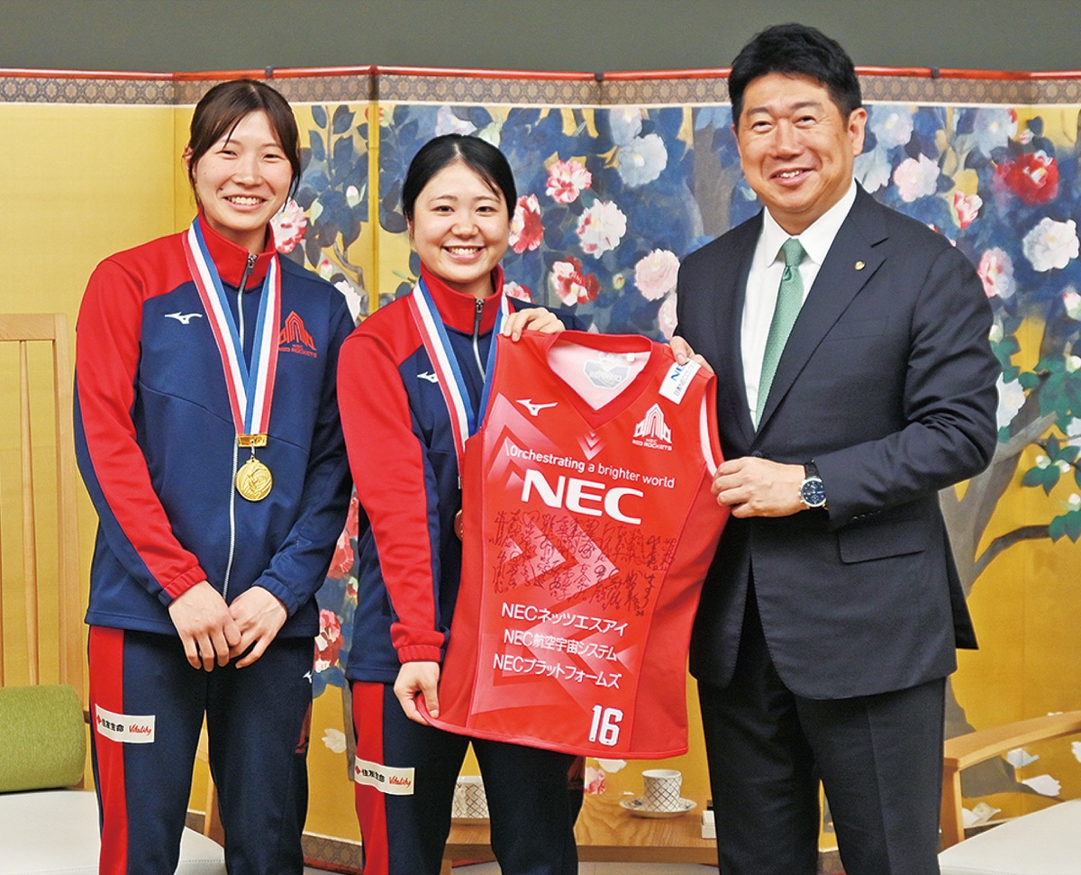 女子バレーボールのⅤリーグ・ディビジョン1に所属するNECレッドロケッツの中西了将(りょうすけ)GM、金子隆行監督、柳田光綺(みずき)選手、藤井莉子選手が5月7日、川崎市役所を訪れ、福田紀彦市長に2023-24シーズンのリーグ優勝を報告した。