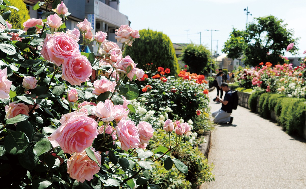 春の一般開放が5月26日(日)まで行われている生田緑地ばら苑(多摩区)。向ヶ丘遊園駅方面から同苑に向かう川沿いの遊歩道でも多くのバラが色とりどりに咲いている=写真。11日の取材時には、さまざまな色のバラをカメラに収める人や香りを楽しむ人の姿などが見られた。