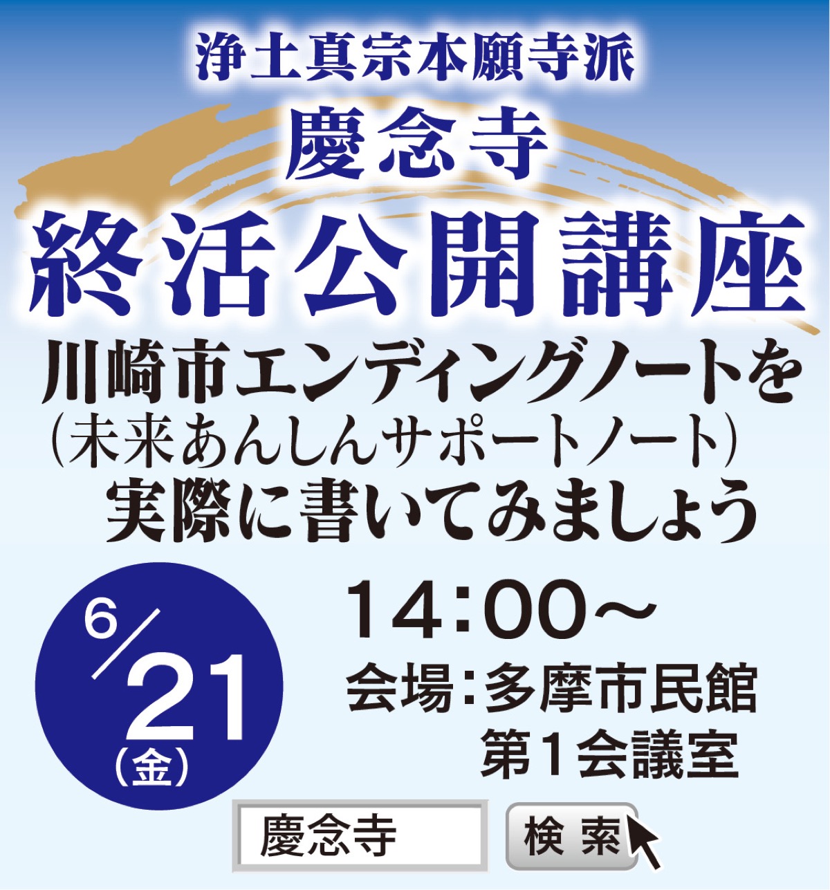 多摩区にある浄土真宗本願寺派・慶念寺(きょうねんじ)が6月21日(金)、無料の終活公開講座を開く。多摩市民館第1会議室で午後2時から。定員30人。要予約。
