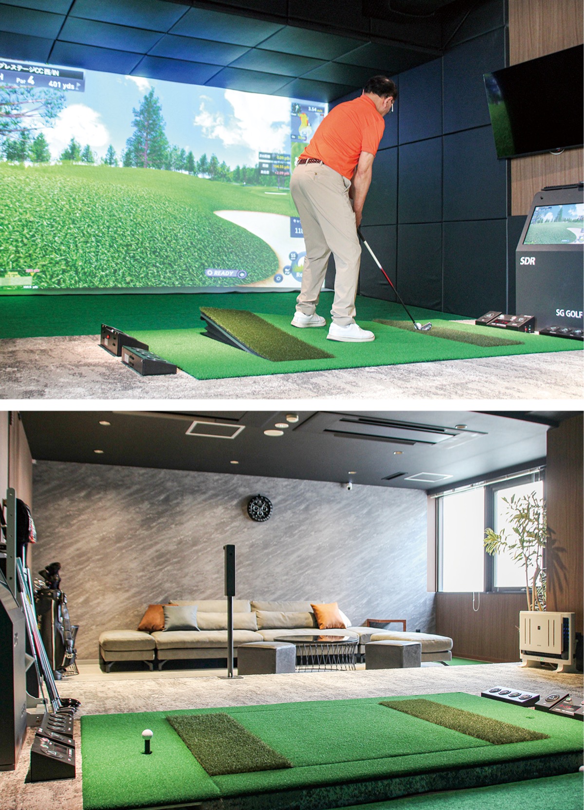 最大の特長は広々ゆったりとしたラウンジ。1ブースのみの完全プライベート空間でプレーを楽しめるだけでなく、得意先との商談などにも◎。ダンロップ徹底監修のシミュレーターは高解像度のラウンド体験や一打ごとの詳細なスイング分析が可能。画面のコースに連動して傾斜ができる臨場感あふれる打席も。