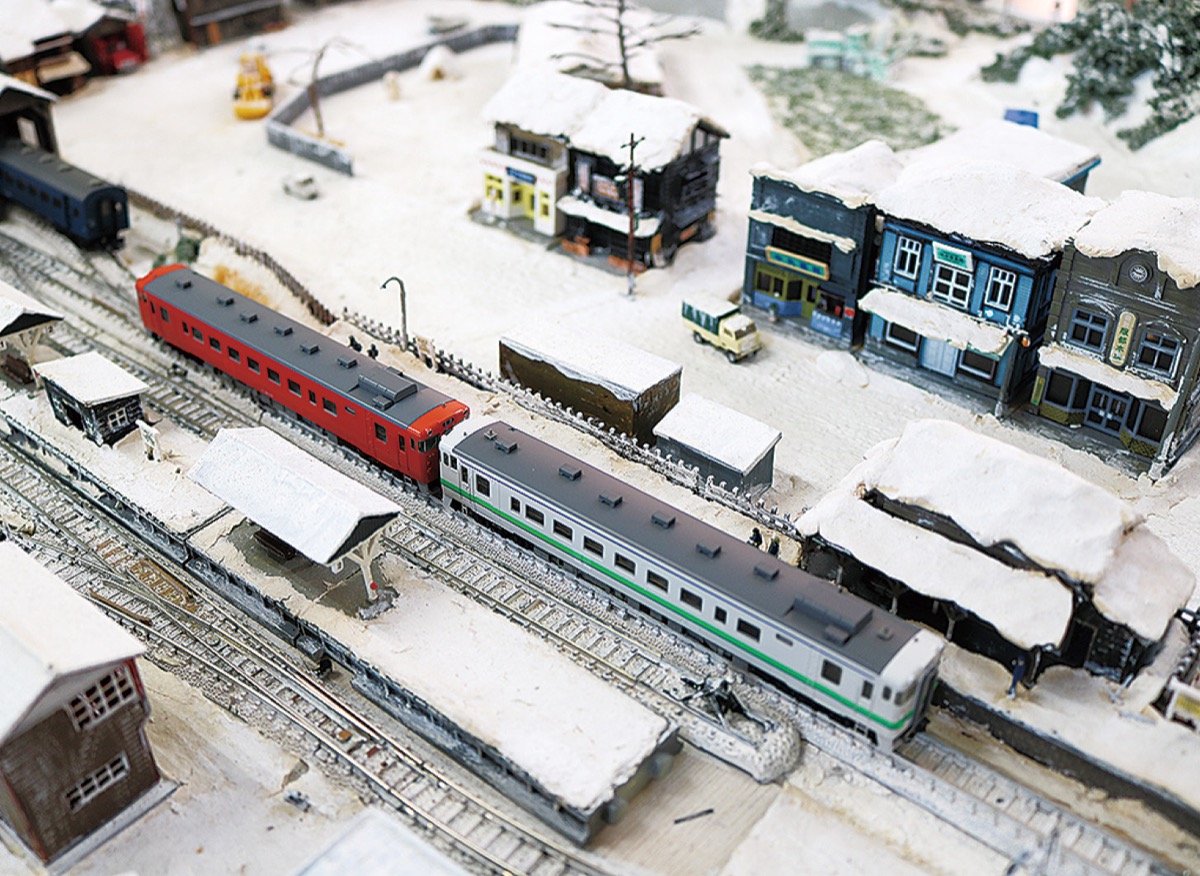 パーツを購入するだけでは飽き足らず、ゼロからジオラマを作るように。板の上にレールをどのように配置するか線を引く。実際にレールを置いて、駅や田んぼ、建物など「どんな風景の中を鉄道が走ったらよいか」イメージを膨らませていくのが醍醐味だという。高低差のある山々など、組み立てていく。雪景色は白い色を塗っていき、本当に北国を鉄道が走っているように見せる。「さまざまな風景の中を電車が走る姿は、いつまでも見ていられる」と二上代表は笑顔を見せる。