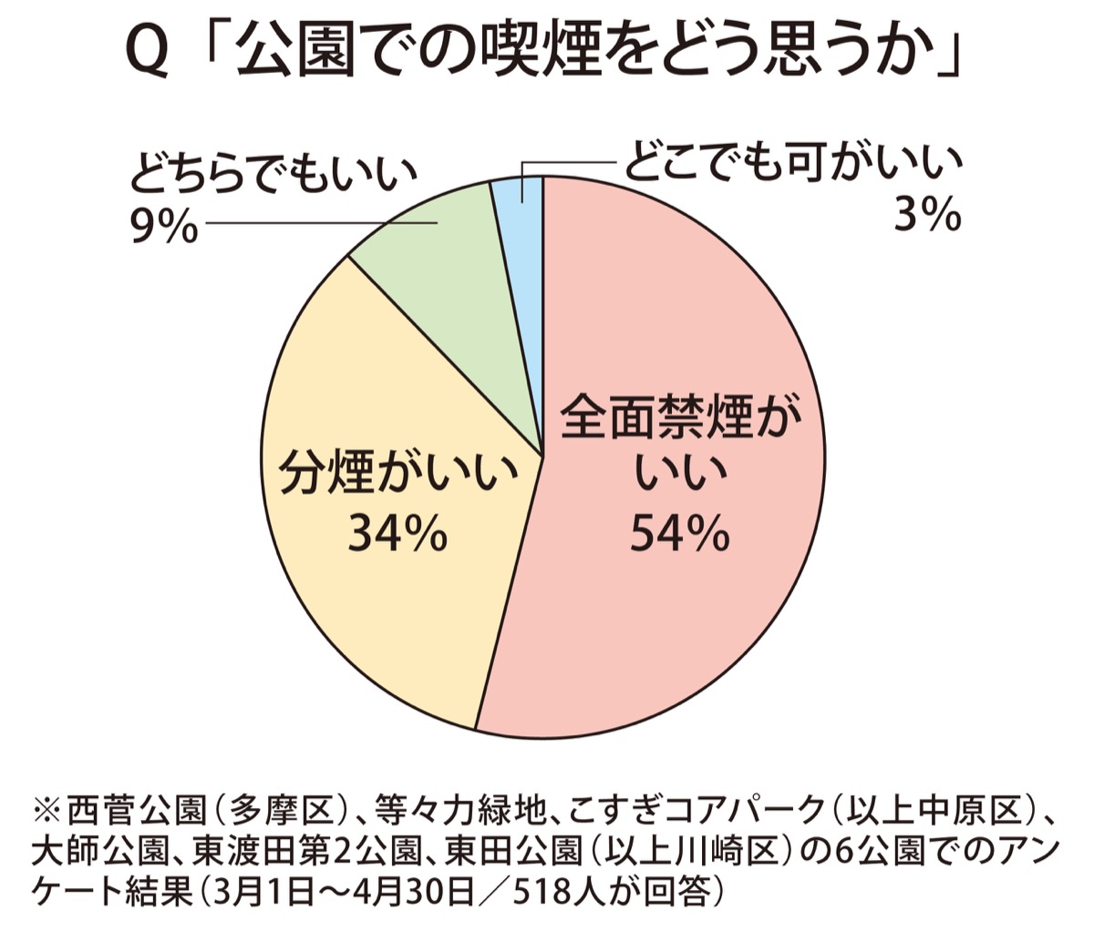 市は、望まない受動喫煙、火災の懸念などについて、公園利用者から苦情や相談が複数件寄せられていたことを受け、3月1日から4月30日まで、西菅公園や等々力緑地(中原区)など市内6公園で「全面禁煙化」の取り組みを試行。周知看板やポスターなどを掲示したほか、調査員による見回りを行った。公園内での喫煙について、利用者にはアンケート調査を実施した。