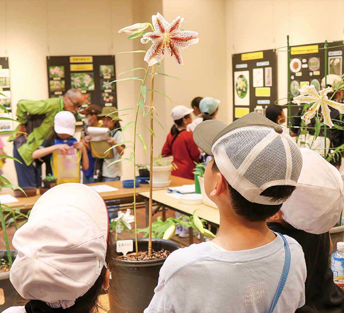 麻生ヤマユリ植栽普及会(松田肇会長)と麻生区が主催した。区内各地で植栽活動も行う同会会員が育てたヤマユリが14鉢展示されたほか、育て方などを紹介するパネルも並んだ。8日には百合丘小学校の3年生約140人が会場を訪れた=写真。児童はじっくりと観察しながら会員に積極的に質問をした。松田会長は「多くの人に見てもらえた」と笑顔を見せた。