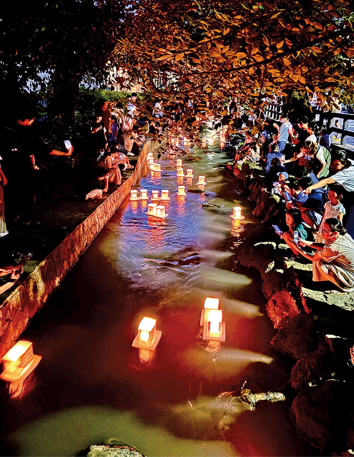 二ヶ領用水宿河原堀(多摩区)の灯籠流しが8月18日に行われた。先祖への思いや願いごとを込められた約600個の灯籠が水面を幻想的に照らした。