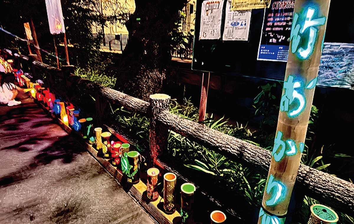 当日は宿河原駅前商店会と稲田中の美術部員、稲田小の児童らが、LEDライトなどを使って7月に作った竹あかりのオブジェ約50個が川べりに並び、20年以上続く伝統行事に彩りを添えた。
