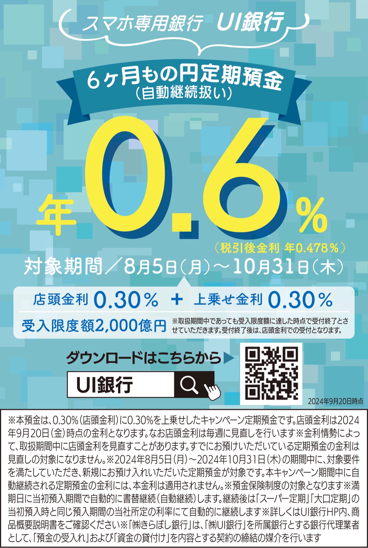 UI銀行は、スマートフォン専用の銀行として、全世代のデジタルシフトのサポートに加え、高金利と手数料優遇サービスを展開している。そのUI銀行では、8月5日〜10月31日を対象期間に、6ヶ月もの円定期預金の金利を年0・6%(税引き後 年0・478%)としている。