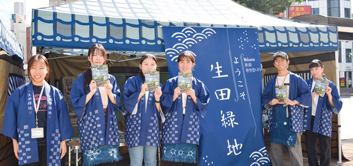 「会場への最初のおもてなし」ポイントとして、一般社団法人多摩区ソーシャルデザインセンター(多摩SDC)は、向ヶ丘遊園駅南口にフェアの周知や案内を行うインフォメーションブースを設置した。特徴的なのは、緑地内にある日本民家園を模した外観のテント。「生田緑地らしさを伝えられるようこだわった」と、多摩SDCの学生副代表を務め、企画を主導した原島実来さん(大学4年)は語る。期間中は午前9時30分から午後3時までスタッフが常駐。パンフレットと一緒に、フェアのために作られた「ばらサイダー」やかわさき名産品にも選ばれた「TAROの夢最中」などを無料配布する。