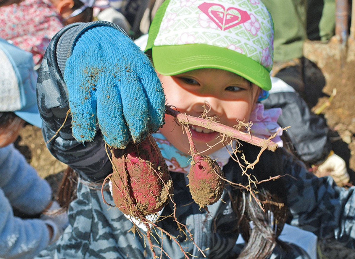 「早野聖地公園里山ボランティア」(小林昌幸会長)の協力のもと、毎年行っている。今年は初めて苗植えから実施。当日、子どもたちは「お芋はできていますか」「大きくなったかな」と口にしながら畑を訪れた。同団体会員の指導のもと、手で土を掘り起こし芋を見つけると「3個もとれた」「意外と簡単」とうれしそうな声をあげた。