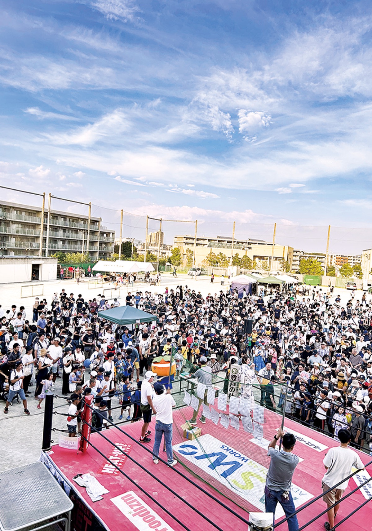 同町内会といえば夏フェス。2019年、地域の小中学生から夏祭り、住民からは盆踊りの実施を望む声が上がり、同じ敷地内にあるはるひ野小・中学校の閉庁日を利用して夏に校庭で祭りを開催。ステージや屋台を設けた手づくりイベントに約500人が来場した。翌年から2年間はコロナ禍で中止したが22年、参加条件を厳格に定めるなど感染対策を徹底して再開すると2700人が訪れた。翌23年も同等の人出でにぎわい、今年は3002人が来場。運営も小学生から大学生までの若者を含め総勢約120人が携わり、地域の一大イベントに成長した。「来場者の半数が中学生以下。子どもたちの大きな期待を背負っている」と杉本会長は話す。