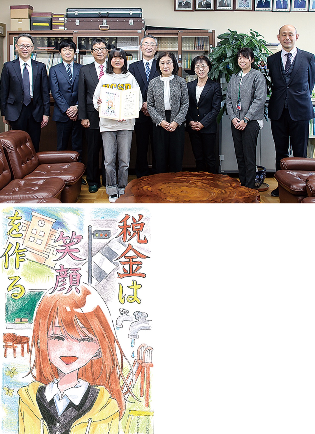 小高さんは身の回りの税金が使われている施設などを女の子が想像する様子を描き「税が身近で使われていることを皆に知ってほしかった。選ばれると思っていなかったのでうれしい」と笑顔を見せた。田村会長は「小学生が皆に税を知ってもらいたいという思いを描いてくれて頼もしい」と総括。碓井部会長は「税金が何に使われているのか今の小学生はよく理解しており、絵に表れている」と賛辞を述べた。同会は各受賞者を訪れ表彰した。小高さん以外の受賞者は以下。敬称略。
