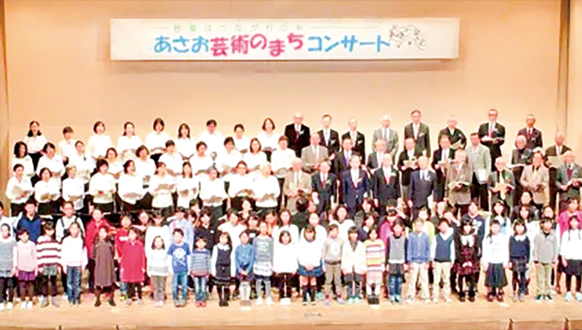第1部ではギター・ソプラノのコンビと、サクソフォン4重奏がそれぞれ情熱的な演奏を披露。第2部は小学3年生からシニアまで総勢約90人の「あさお芸術のまち合唱団」、区内在住のプロ演奏家を中心に集まった「あさお芸術のまち合奏団」が舞台に立つ。