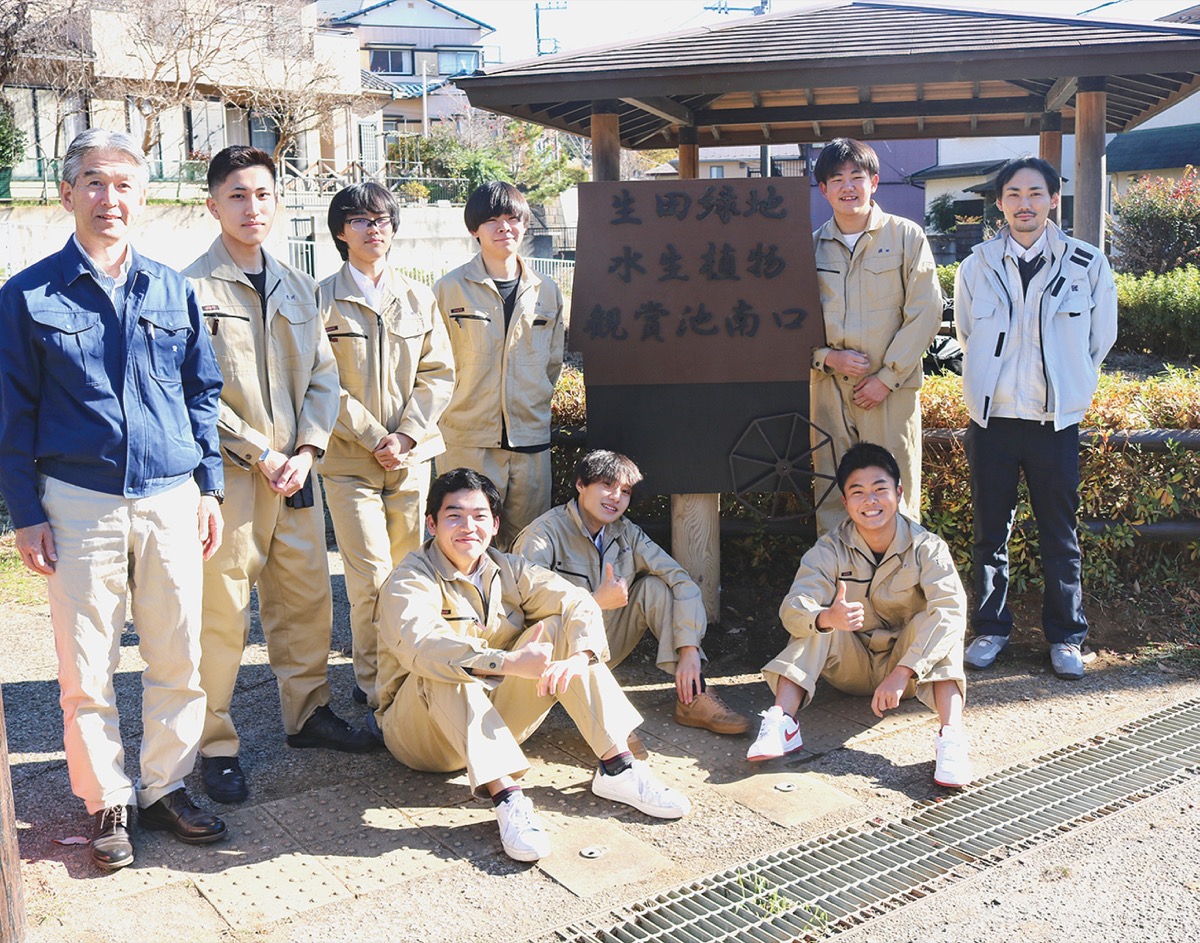 生田緑地にある「水生植物観賞池南口」(宮前区初山)に12月16日、県立向の岡工業高校(多摩区堰)の3年生有志7人が手作りの入口看板を設置した。